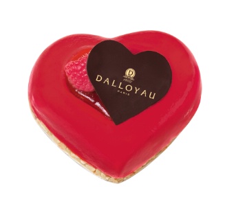 Le Rouge Baiser de Dalloyau renferme un croustillant fait d'amandes, de riz soufflé et de feuillantine, une mousse au chocolat blanc citronné, un biscuit aux amandes et une compotée de framboises au gingembre (Dalloyau, 101, rue du Faubourg Saint-Honoré, 75008 Paris et aux Lafayette Gourmet, 48-52, boulevard Haussmann, 75009 Paris).