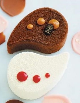 Angelina propose une alliance Yin & Yang: Le Yin composé d’un biscuit chocolat sans farine garni d’une mousse chocolat aromatisée au cacao 67% Origine Pérou rehaussé d’éclats de chocolat croustillants tandis que le Yang y oppose une meringue craquante à la vanille et aux éclats de framboise recouverte d’une mousse framboise, d’un lit de gelée de framboise pépin, le tout enrobé d’une élégante coque de chocolat blanc (Angelina, 226 Rue de Rivoli, 75001 Paris).