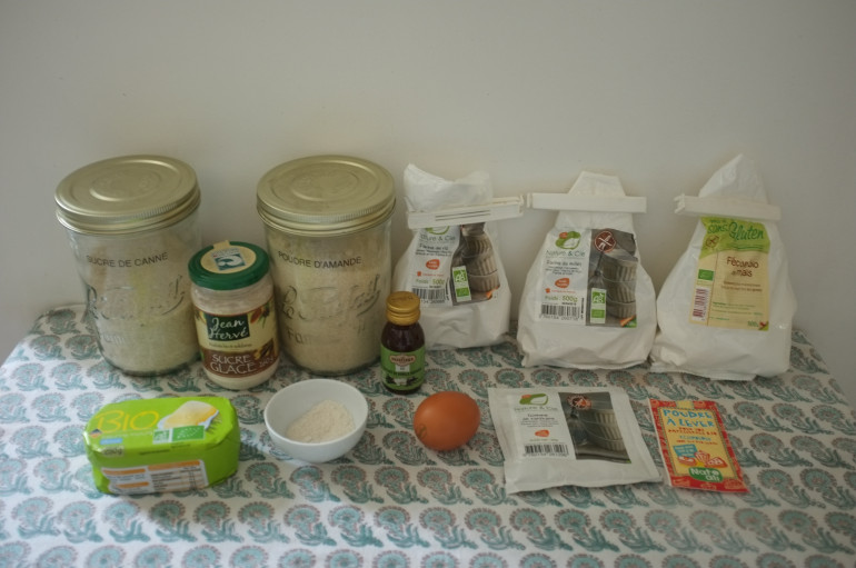 Mélanger d’abord bien ensemble les ingrédients secs : poudre d’amande, farines, fécule, gomme xanthane, poudre à lever, sel. Puis ajouter le sucre glace et le sucre de canne. Bien mélanger à nouveau. Garder de côté. Verser ce mélange dans le bol du mixeur. Ajouter le beurre coupé en petits morceaux, l’œuf et la vanille et mixer à vitesse rapide jusqu’à ce qu’une pâte se forme et que le beurre soit bien incorporé. La pâte est épaisse.