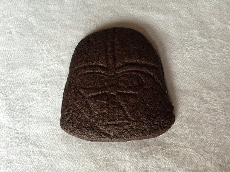 Pour "Darth Vador", j’ai utilisé la recette déjà publiée sur RTL.fr des petits sablés sans gluten au chocolat, et un emporte pièce de cloche de Pâques pour faire le casque, les reliefs sont faits avec la lame fine et plate d’un couteau et la pointe d’une pique en bois ! Attention, encore une fois, il faut bien laisser durcir la pâte sans gluten au réfrigérateur avant de découper les formes à l'emporte pièce.
