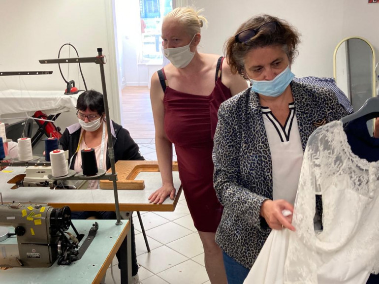 Ces vêtements sont donc fabriqués par des salariées en insertion à Calais, un peu plus au Nord. L’association Concept insertion reçoit les commandes d’Amélie mais aussi d’autres créateurs parisiens ou nordistes. En plein centre ville, une vingtaine de couturières sont employées sous la direction d’Angélique Tavernier.