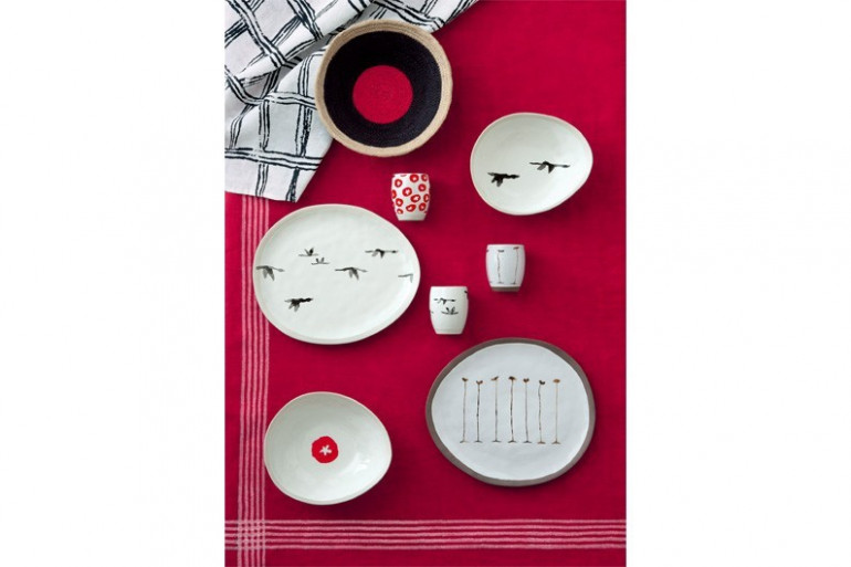 Comme une invitation au voyage, les oiseaux de Marion Lesage s'envolent et s’installent sur les assiettes, les étoiles décorent le linge de maison tandis