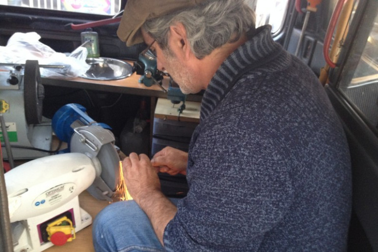 Il circule à bord de son véhicule avec ce concept unique : l'affûtage de rue. "La plupart des jeunes ignorent ce qu'est un rémouleur. Quant aux anciens, ils s'étonnent que cela existe encore et se rappellent du papy qui passait", s'amuse notre artisan.