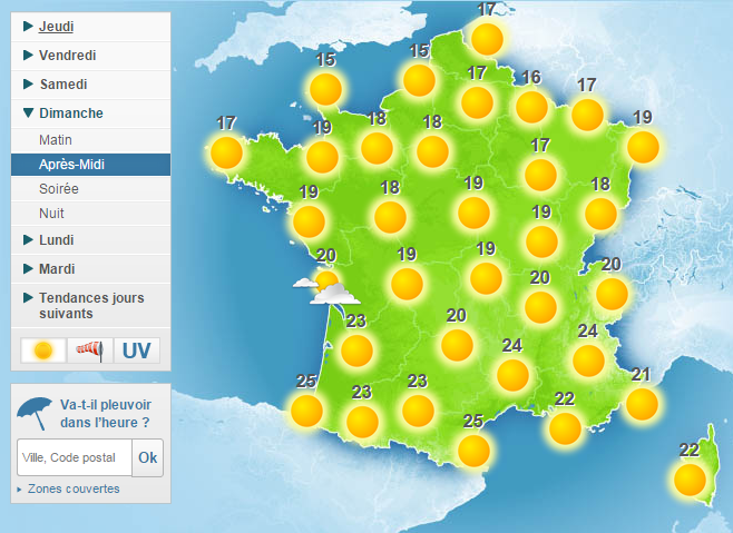 Selon Météo France, la journée du vendredi 8 mai ne sera pas idéale sur une grande partie du territoire. Seules les régions PACA, Corse et Aquitaine seront ensoleillées du matin au soir. Le samedi 9 mai sera bien plus agréable. Le Nord-Est devrait toutefois subir la pluie une grande partie de la journée, alors que la situation, mal engagée dans le quart Nord-Ouest le matin, s'améliorera au tournant de l'après-midi. Le temps sera particulièrement clément dans la moitié Sud de l'Hexagone, avec un léger mieux dans le Sud-Est, jusqu'au Languedoc-Roussillon.