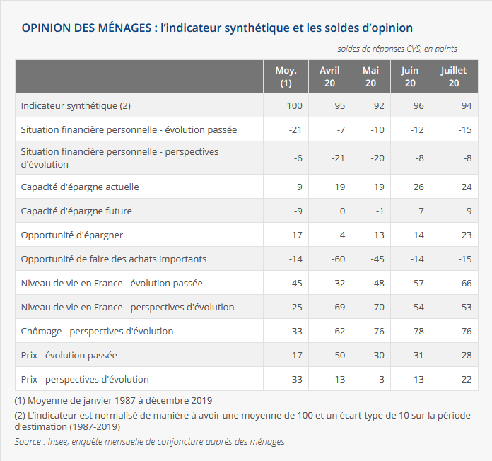 Pour prendre la température du pays, l'Insee interroge "environ 2.000 ménages", par téléphone. À partir des réponses des sondés, un "solde d'opinion" est calculé "par différence entre les pourcentages de réponses positives et négatives." C'est l'évolution de ce solde qui est observé : en juillet, il est de 94. Il perd deux points par rapport à juin, et "reste en dessous de sa moyenne de longue période (100)."