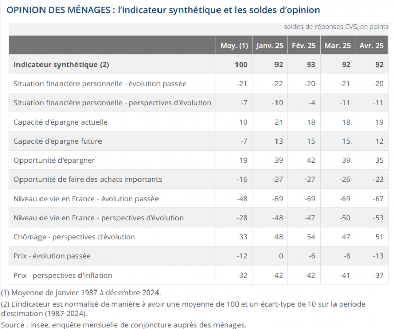 Pour évaluer le climat économique du pays, l'Insee interroge environ 2.000 ménages par téléphone. Les réponses permettent de calculer un "solde d'opinion", obtenu en soustrayant le pourcentage de réponses négatives des positives. C'est l'évolution de ce solde qui est suivie : en avril, il s'établit à 94, comme au mois de mars, et reste inférieur à sa moyenne de long terme (100).
