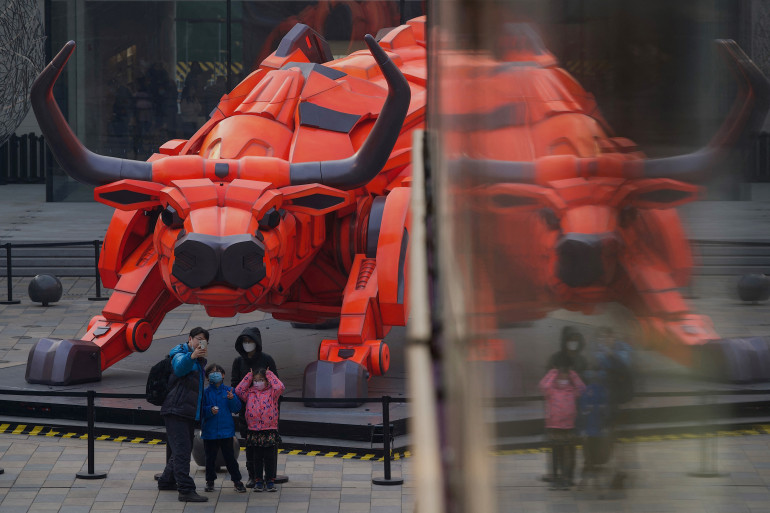 Une famille devant un buffle à Pékin le 11 février