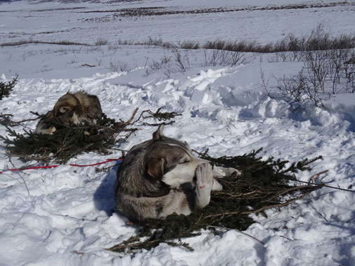 Une énorme secousse. Je me suis retrouvé en l’air et suis retombé lourdement. Le temps de retrouver mes esprits, le traîneau et les chiens avaient disparu. Je les ai retrouvé 200 mètres plus bas coincé dans une ornière très profonde. Tout le monde allait bien, sauf Quest qui souffrait d’une légère contorsion à l’épaule. Miracle !