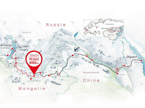 Nicolas Vanier a enfin rejoint les montagnes mongoles. Les conditions sont optimales puisque grâce au relief il évolue sur une couche de neige de 10 à 40 centimètres ce qui lui permet de progresser sereinement, d'oublier le vent, le froid et les privations rencontrés dernièrement durant le voyage.