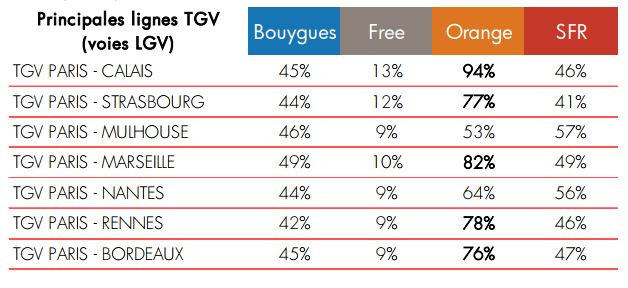 La liaison Paris-Calais est la mieux couverte. 94% des pages qui s'y chargent en moins de 10 secondes pour les clients de l'opérateur historique contre 46% chez SFR, 45% chez Bouygues et 13% chez Free. Le schéma est le même sur les liaisons Paris-Marseille, Paris-Bordeaux, Paris-Rennes et Paris-Strasbourg.