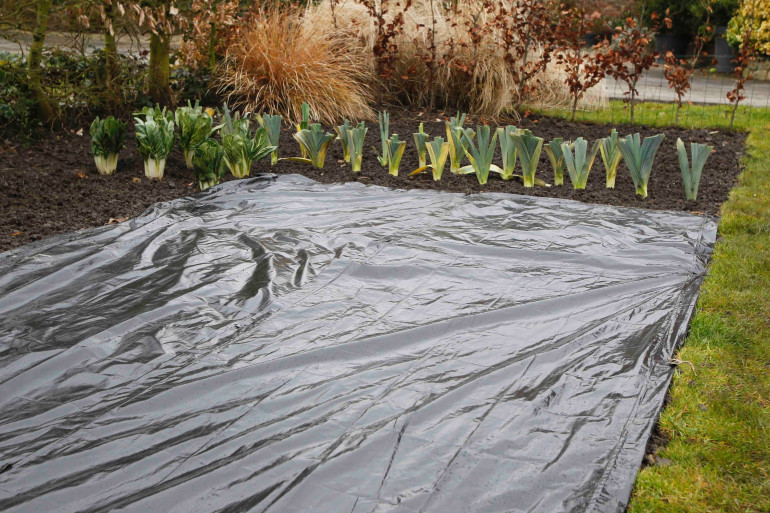 Pour ceux qui détestent bêcher. Couvrez sans tarder la surface de la future plate-bande avec la nouvelle bâche hivernale de Nortene, une marque que l’on trouve dans toutes les jardineries. Cette bâche répond au doux nom de Nestol. Elle est noire, avec des œilletons sur les côtés pour la fixer avec des clous crantés. Garantie anti-UV et bien plus durable que les bâches que l’on utilise habituellement à cet effet.