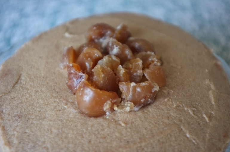 La crème de marron est simplement travaillée avec un peu de beurre pour lui apporter de la tenue et légèrement parfumée de rhum (optionnel si il y a des enfants à table). Le dessus du gâteau est ensuite très simplement décoré de brisure de marron glacé (car les brisures sont un peu moins chers que les marrons glacés entiers). Vous pouvez également, si vous êtes très gourmand, déposer un peu de fines brisures sur la garniture entre les deux étages des gâteaux...