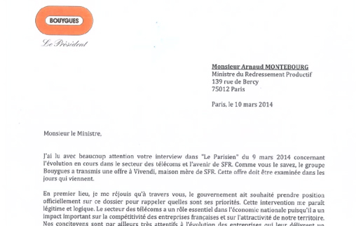 Lettre de Martin Bouygues envoyée à Arnaud Montebourg