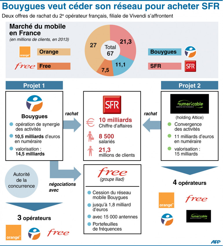 Le monde de la téléphonie est en pleine ébullition. La vente de l’opérateur en difficulté SFR attise les convoitises des ses concurrents. Dans la bagarre, s’affrontent en première ligne Bouygues Telecom et Numericable.