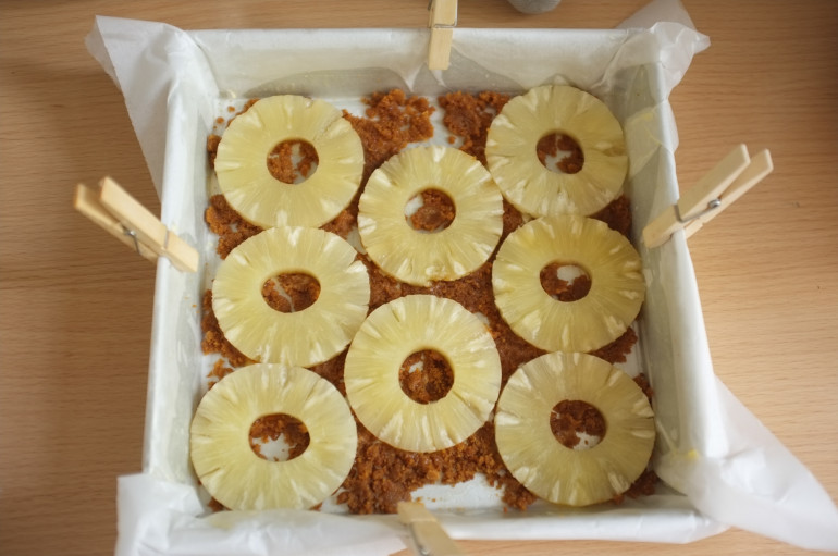 Préchauffé le four à 175°C. Beurrer un moule carré ( ici 23 X 23 cm), le recouvrir de papier cuisson et beurrer aussi le papier cuisson. Mélanger ensemble, au mixeur ou avec un batteur, 30g de beurre et le sucre brun, environ 3mn jusqu’à obtenir une texture de crumble. Étaler cette mixture dans le fond du moule et garder de côté. Déposer les rondelles d’ananas sur cette mixture.