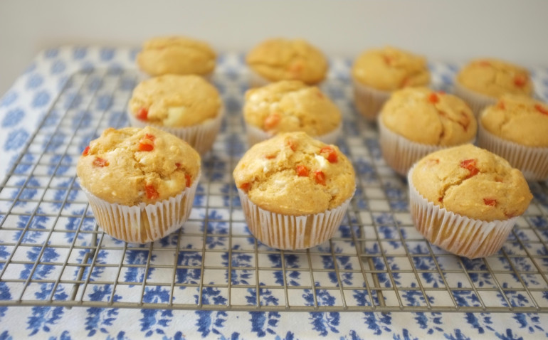Ajouter les petits morceaux de poivron et la féta. Bien mélanger à l’aide d’une spatule en silicone ou d’une cuillère en bois. Diviser la pâte à muffins dans les petits moules en papier. Cuire 25mn. Laisser reposer 5 mn dans le moule en métal puis retirer les petits moules papier pour les laisser refroidir sur une grille.