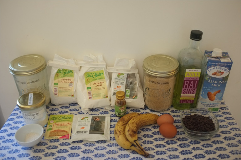 Préchauffer le four à 175° C et mettre les petites caissettes en papier dans les cavités du moule pour 12 muffins. Mélanger ensemble dans un bol les ingrédients secs : farines, fécule, poudre d’amande, gomme xanthane, sel, poudre à lever, bicarbonate. Garder de côté. Dans le bol du mixeur, mélanger les ingrédients humides : la purée de bananes, l’huile, le lait, l’extrait de vanille. Bien mélanger.