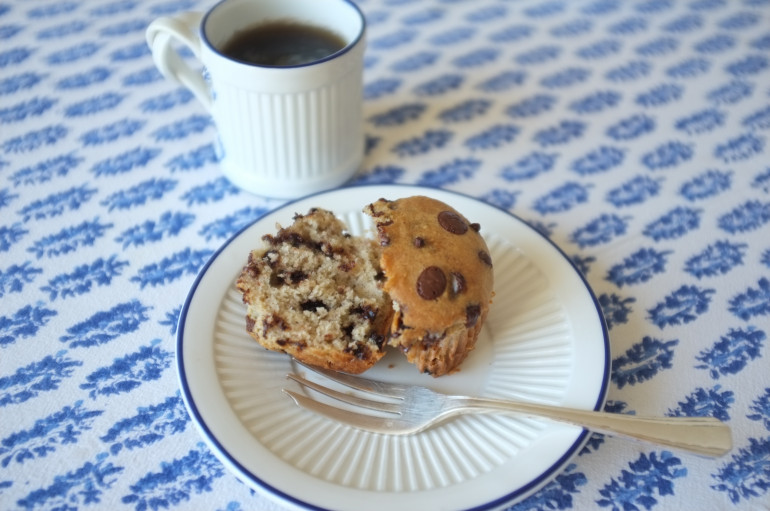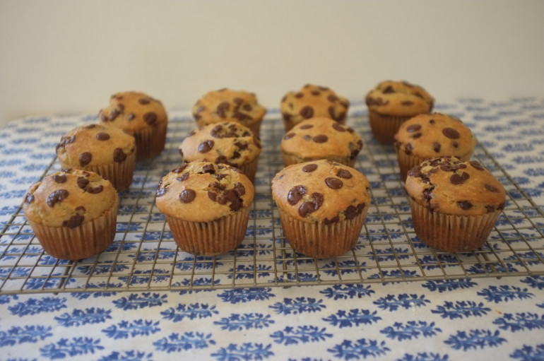 Ajouter le sucre, puis ajouter les œufs, un après l’autre en s’assurant de la bonne incorporation entre chaque addition. Verser dans cette préparation le mélange des ingrédients secs. Si la pâte semble trop épaisse, ajouter une cuillère de lait. Verser délicatement les 130g de pépites de chocolat et mélanger à l’aide d’une spatule en silicone pour ne pas casser les pépites avec la force du mixeur. Verser la pâte dans les petites caissettes en papier du moule à muffins. Ajouter à la main, pour chaque muffin, quelques pépites de chocolat pour décorer le dessus.