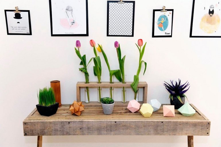 Il y a même des modèles à réaliser : table basse, étagère, fauteuil, tabouret, tête de lit avec table de nuit intégrée, bibliothèque et même un îlot de cuisine réalisable en 2 heures. Autre possibilité, un soliflore réalisable en une heure avec des chutes de palettes. C’est une petite étagère percée de 5 trous dans lesquels on dispose 5 tubes éprouvettes pour mettre des fleurs. La finition est superbe, c’est de la peinture à la cendre.