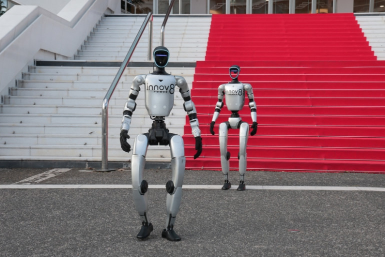Deux robots humanoïdes devant les marches du Palais des Festivals à Cannes., le 12 février 2026.
