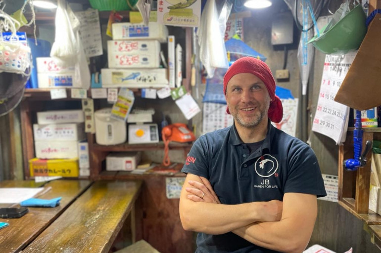 Jean-Baptiste Meusnier est l’un des ambassadeurs du ramen à Paris. On le retrouve dans l’un de ses deux restaurants parisiens, Kodawari Tsukiji. La salle du restaurant est un petit bout du célèbre marché aux poissons de Tokyo. Des tabourets autours de tables en bois, des faux poissons dans des bacs de glaces, des kanjis sur les murs.