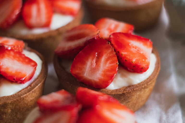 Équeuter les fraises et coupez-les en quartiers, couper la tête des framboises. Retourner les sablés, pocher de la crème chantilly sur les sablés et déposer des morceaux de fraises ou des framboises à l’envers. Tu peux mettre les deux. Saupoudrer de sucre glace. Déposer des amandes.