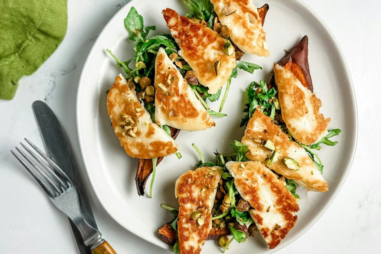 Couper l’halloumi en bâtonnets. Dans une poêle chaude, verser un trait d’huile d’olive, déposer les bâtonnets, verser un peu de miel, les laisser colorer et caraméliser et les retourner, vous pouvez ajouter encore un peu de miel. Sortir le plat du four, déposer l’halloumi sur les potimarrons cuits et verser la sauce, finir avec les feuilles de persil.