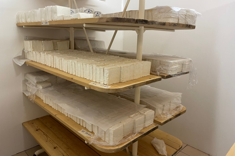 "D'abord on met la présure dans le lait pour le faire coaguler, on laisse poser une heure et demie, ensuite on sépare la matière coagulée du petit lait". Le fromage qui ressemble à ce stade à une feta beige est ensuite mis dans des moules carrés à égoutter. Il est ensuite salé, puis retourné tous les jours pendant 10 jours dans différentes pièces avec des taux d'humidité et des températures différentes.