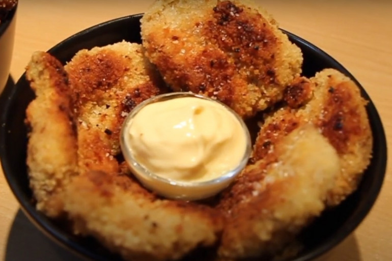 Ensuite, on émiette des crackers de riz. On prend ces petits médaillons que l'on trempe dans la sauce soja puis dans la chapelure. On les met à frire dans de l'huile de pépins de raisin et pour éviter que cela brûle, il faut mettre les crackers de riz au dernier moment dessus. "C'est quand même assez sport", conclut le chef Cyril Lignac.