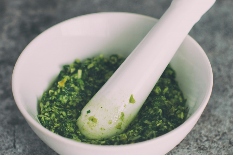 Pour le pesto, verser dans le bol du blender, la poudre d’amandes, la gousse d’ail, le parmesan, les feuilles de basilic, commencer à mixer et verser l’huile d’olive en filet, ajouter le jus de citron en mixant encore. Assaisonner avec du sel fin et du poivre du moulin. Réserver de côté.