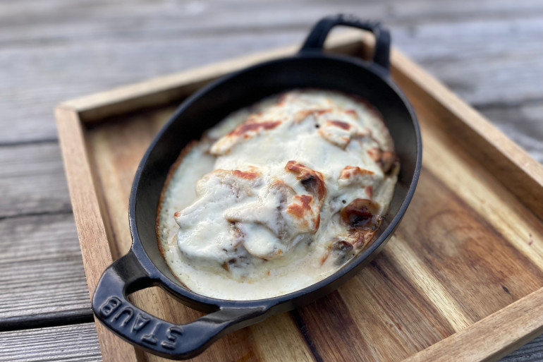 Faites toaster des tranches de pain de campagne assez épaisses, au four ou au micro-ondes. Le pain doit être sec, il peut être de la veille. Mettez les ensuite dans des petites cassolettes ou autre plat allant au four, imbibez les tranches d'un peu de vin blanc, d'une couche de crème de fromage, ajoutez les oignons, les champignons, puis une nouvelle couche de crème de fromage. Enfournez 2 minutes au four en mode grill pour gratiner le plat.