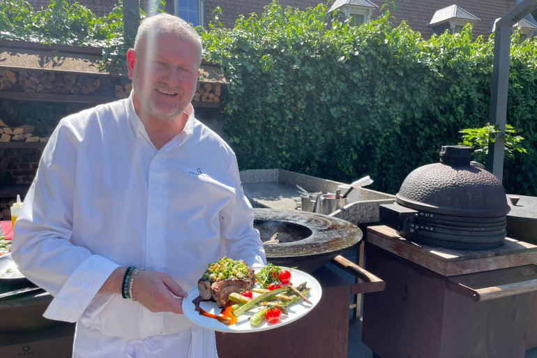 Pendant que la côte cuit, ajoutez les asperges sur la plancha avec un peu d’huile d’olive, ainsi qu’une grappe de tomates, et un oignon doux ciselé, assaisonnez. Vous pouvez également préparer une petite salade en récupérant quelques lamelles d’asperge à l’économe. Mélangez-les avec les herbes, de l’huile d’olive et un peu de jus de citron.