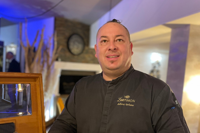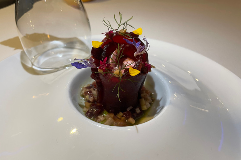 Pour le dressage, alignez deux lamelles de betterave, une lamelle de rouget en répétant l’opération deux fois, puis roulez le tout pour faire une fleur. Déposez-là sur le tartare de légumes. C’est prêt.
