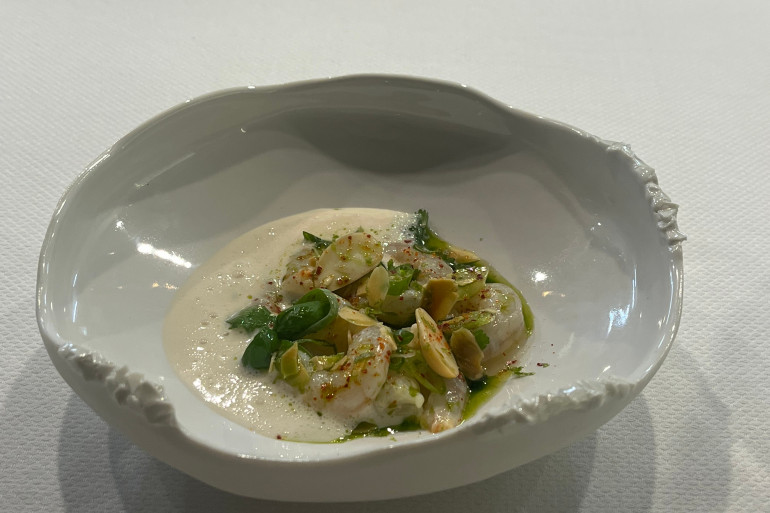 Pour le dressage, disposez une dizaine de crevettes dans par assiette creuse, avec les herbes marinées, ajoutez la sauce, quelques amandes effilées. C’est prêt.