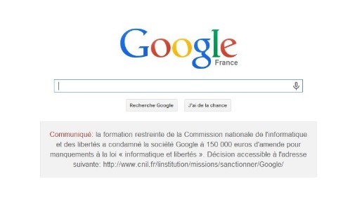 Le géant américain d'Internet Googlea mis en ligne ce samedi sur sa page d'accueil française un encart mentionnant sa condamnation à une amende de 150.000 euros par la Commission nationale de l'informatique et des libertés (Cnil), comme demandé.