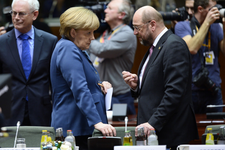 Angela Merkel face à Martin Schulz, à Bruxelles le 19 décembre 2013