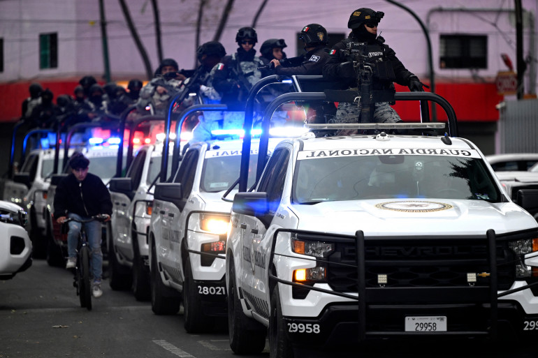 Les forces spéciales de la Garde nationale mexicaine patrouillent autour du siège du Bureau du procureur spécialisé dans la lutte contre le crime organisé à Mexico, après la mort d'un chef de cartel, le 22 février 2026.