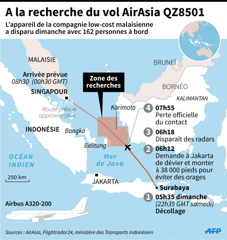 Localisation et chronologie de la disparition d'un vol AirAsia entre l'Indonésie et Singapour.