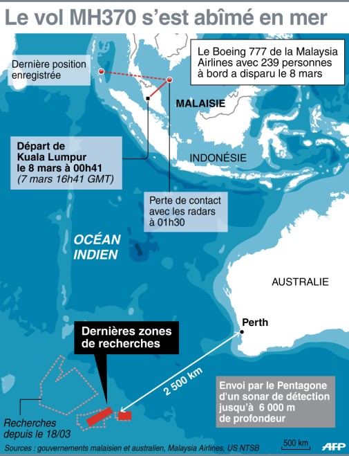 "Selon leurs analyses, MH370 a volé le long du corridor sud et sa dernière position connue se trouvait au milieu de l'océan Indien, a expliqué le premier ministre malaisien. Une position lointaine, éloignée de toute zone possible d'atterrissage, a-t-il poursuivi, et c'est selon ces dernières données, que l'on peut conclure que le vol MH370 a fini sa course dans le sud de l'océan Indien".