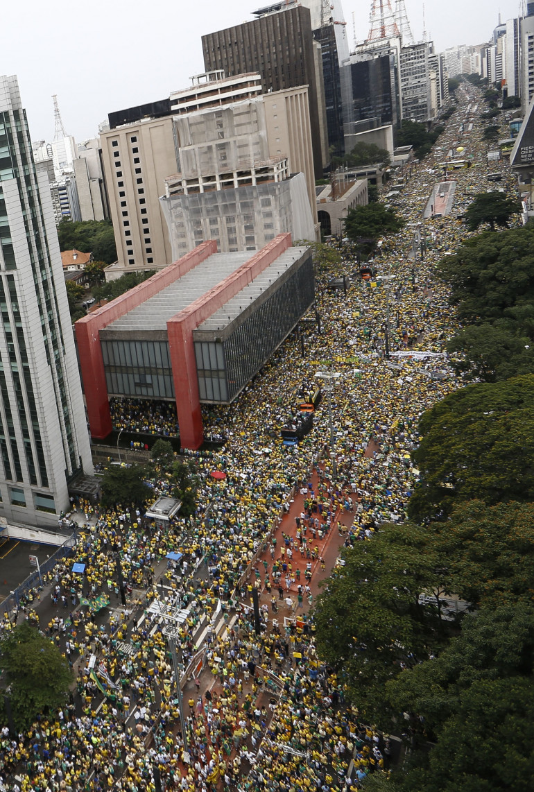A Sao Paulo, mégapole de 11 millions d'habitants et fief de l'opposition, une foule gigantesque en jaune et vert envahissait à perte de vue l'immense avenue Paulista et les rues adjacentes dans le centre-ville, entonnant l'hymne brésilien et réclamant, en grand nombre, la destitution de la présidente, réélue de justesse fin 2014 pour un second mandat.