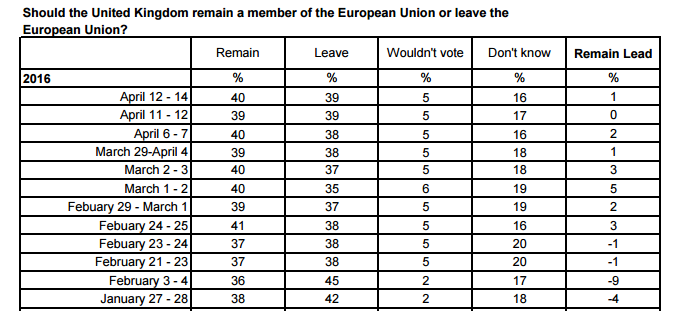 Les intentions de vote très serrées. La colonne "remain" pour les Pro-UE, "leave" pour les Pro-Brexit