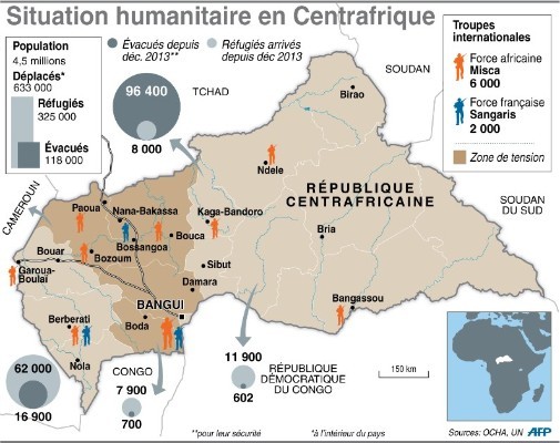 Carte de la République centrafricaine et des pays voisins indiquant le nombre de personnes réfugiées ou évacuées