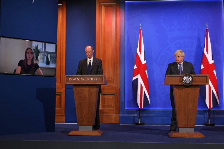 L'épidémiologiste Chris Whitty et Boris Johnson en conférence le lundi 14 juin