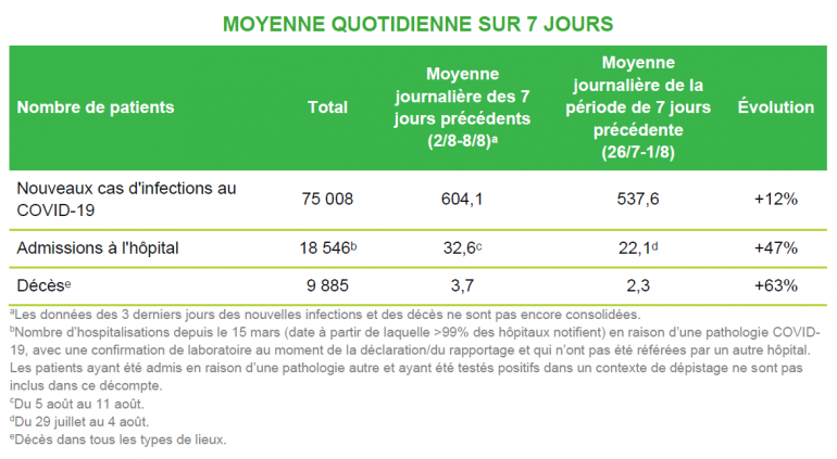 Ce mercredi 12 août, selon le Service public fédéral (SPF) de la Santé, 75.008 cas ont été recensés au total à l'échelle du pays. Entre le 2 et le 8 août, 604,1 nouveaux cas ont été comptabilisés chaque jour en moyenne, en hausse de 12 % par rapport aux 7 jours précédents (537,6 cas par jour). Les admissions à l'hôpital sont en hausse de 47 %, et les décès en hausse de 63 %.