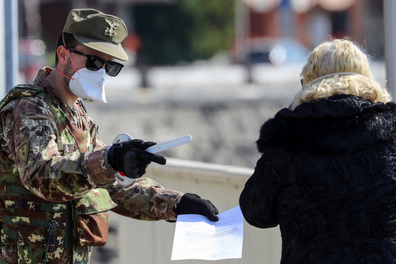 Une femme dialogue avec un militaire italien à Menton, en mars 2020