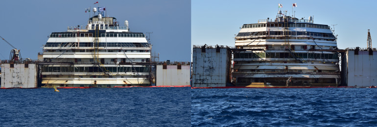 Le Costa Concordia, maintenu par des flotteurs (à gauche) puis après les opérations de renflouement. Photos prises le 14 et le 18 juillet 2014