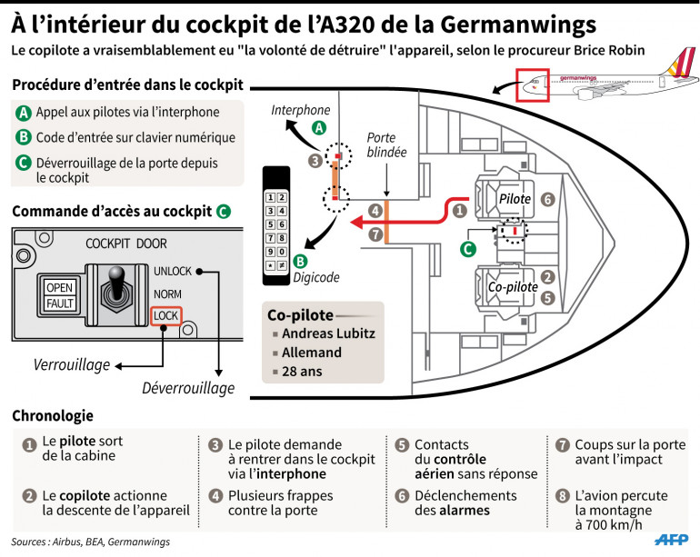 Les raisons pour lesquelles le copilote allemand de l'A320 a précipité l'appareil contre un massif des Alpes restent inconnues deux jours après l'accident. Mais selon les enquêteurs français et le ministre allemand de l'Intérieur, aucun indice ne laisse penser à un acte terroriste. L'enregistrement des dernières minutes du vol laisse entendre que le pilote tente par tous les moyens de revenir dans le cockpit protégée par une porte blindée, mais que le copilote ignore ses appels.