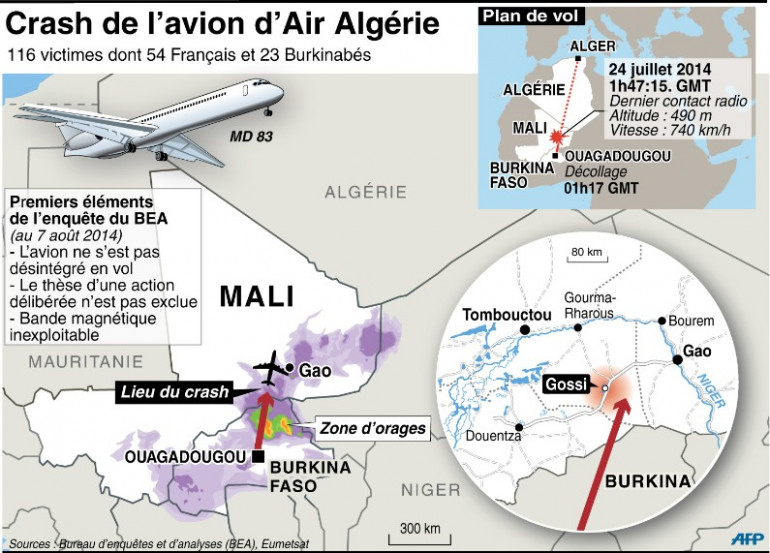 L'appareil, qui devait relier Ouagadougou à Alger, s'est écrasé dans le nord du Mali environ 32 minutes après son décollage avec 116 passagers et membres d'équipage à son bord, qui ont tous péri, dont 54 Français.