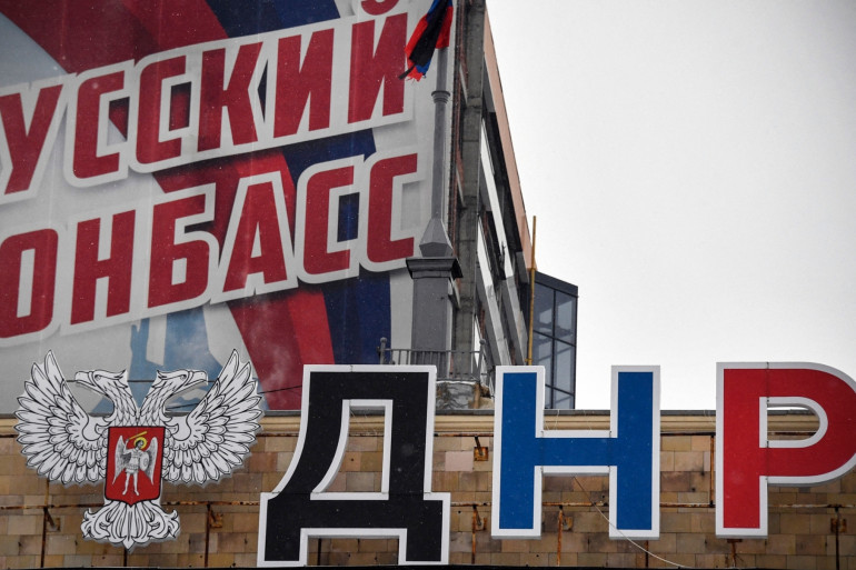 L’emblème de la République populaire de Donetsk et le slogan “Donbass russe”, à Donetsk le 18 janvier 2022