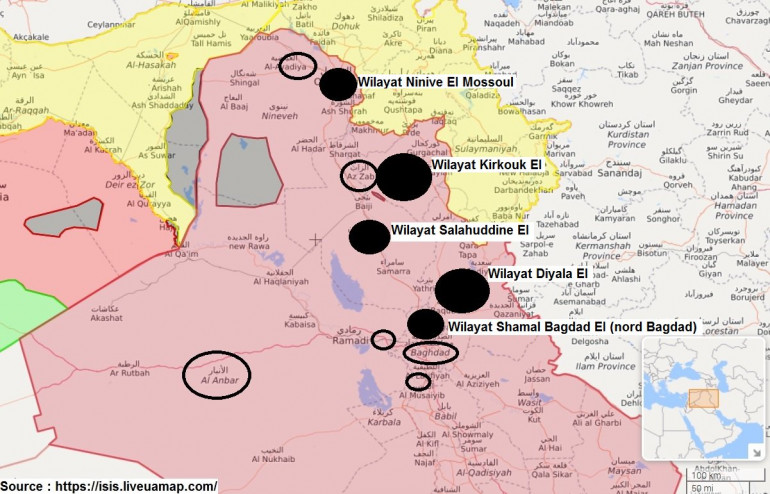 En Irak, les jihadistes de l'État islamique "sont passés à l'insurrection et ils tiennent". Ils sont même implantés dans cinq wilayats (ou provinces), comme le montrent les cercles pleins sur cette carte :